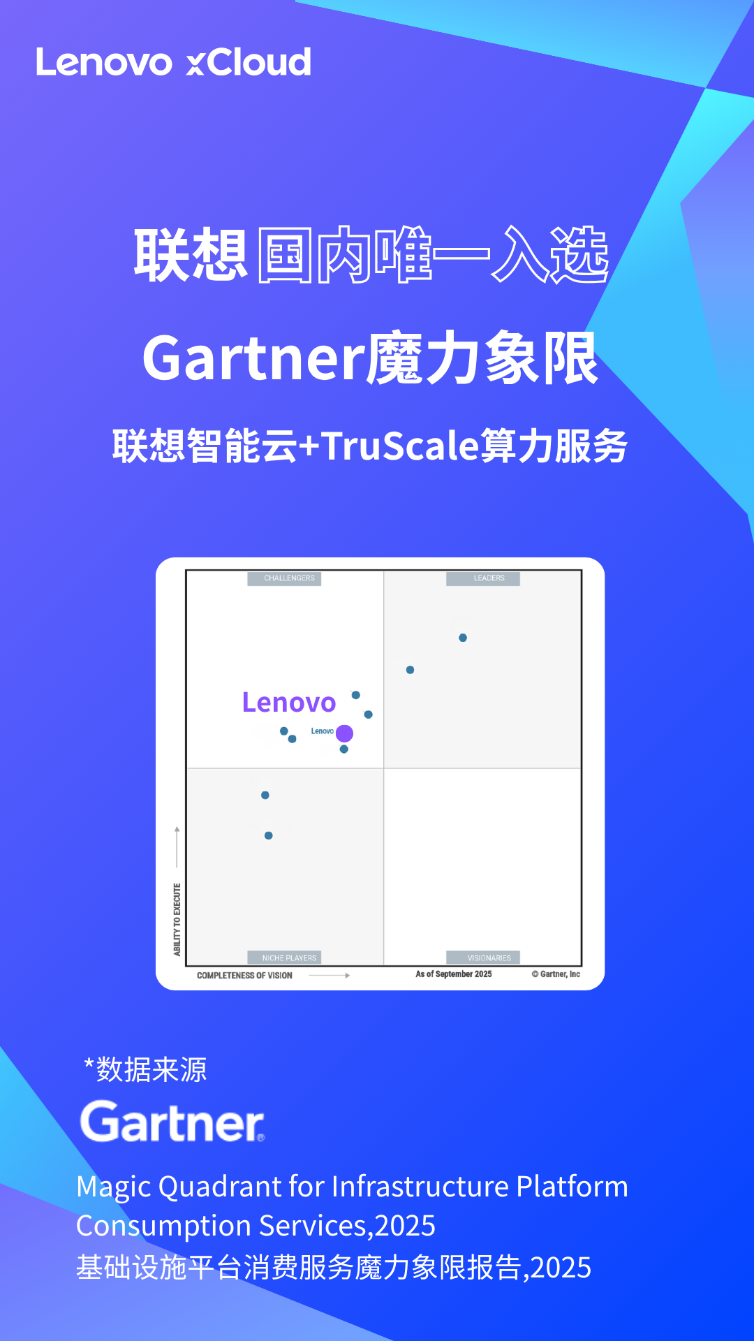 近日,全球IT权威机构Gartner发布了首份《基础设施平台消费服务魔力象限报告》(Magic Quadrant for Infrastructure Platform Consumption Services,以下简称“报告”)。联想凭借联想智能云-混合云平台和“一切皆订阅”的TruScale算力服务,作为唯一入选的中国厂商,跻身“挑战者”象限。