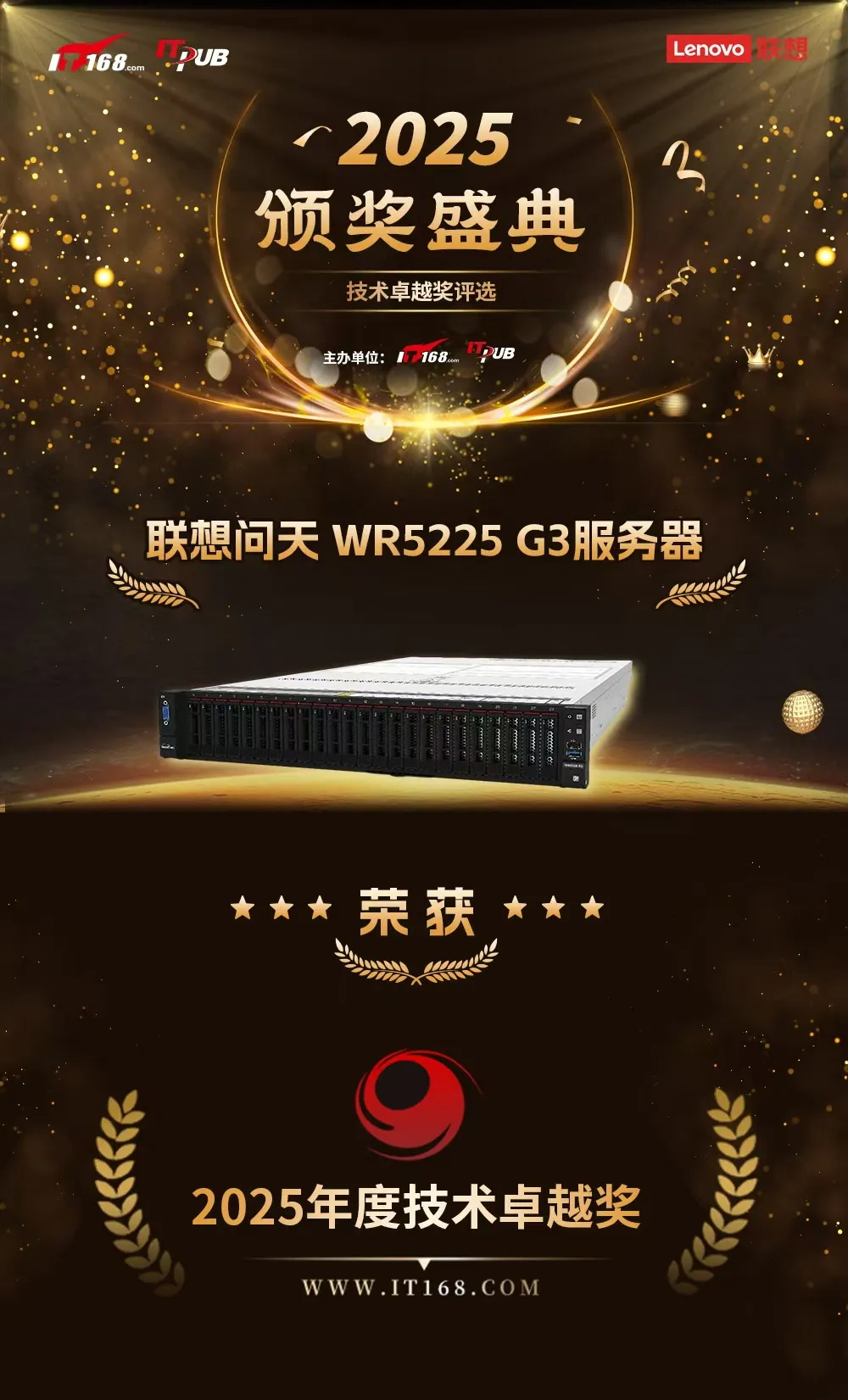 2025年,联想多款服务器接连斩获行业权威奖项:联想问天 WR5220 G5服务器荣获至顶网第二十届凌云奖“技术引领奖 基础引擎奖”,联想问天 WR5225 G3服务器摘得IT168“2025年度技术卓越奖”。这些荣誉是对联想服务器综合实力的高度认可,更是对其持续以本土化创新服务中国数字经济建设的生动印证。